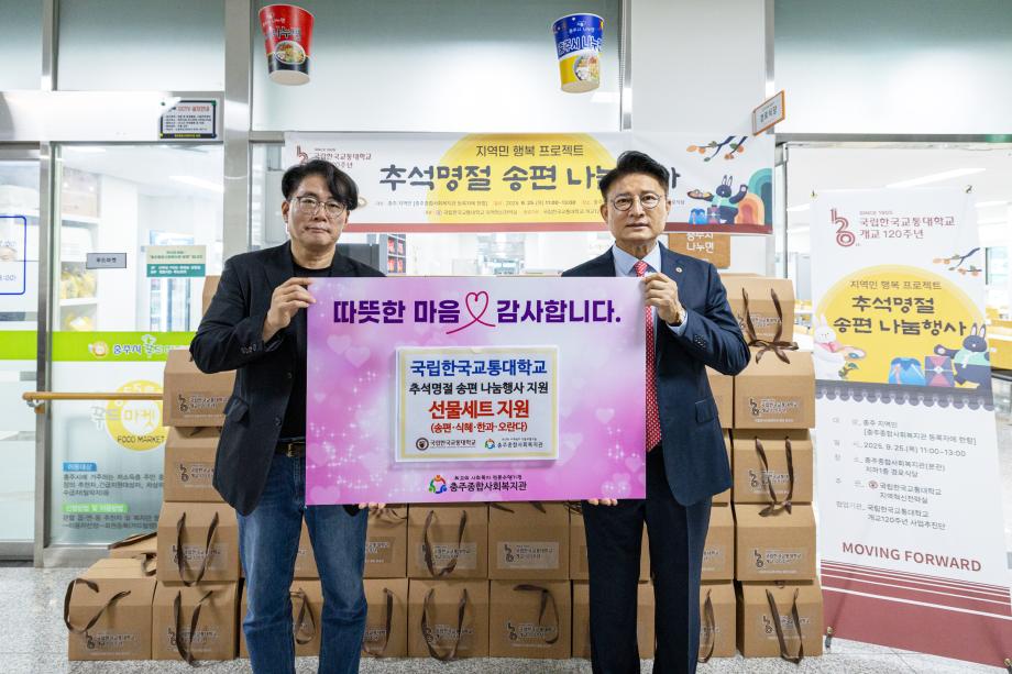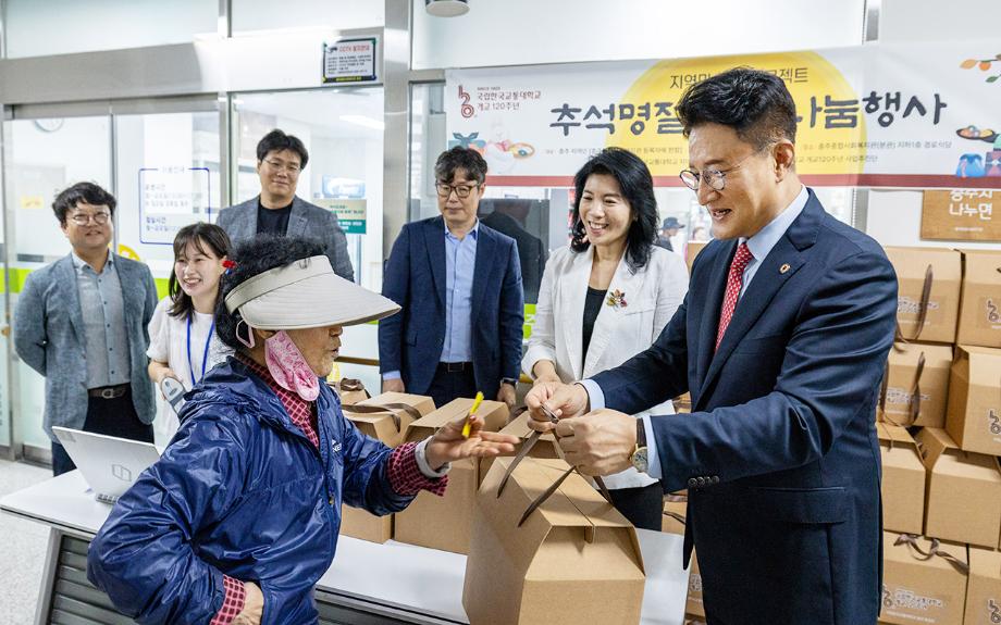 국립한국교통대학교(총장 윤승조)는 9월 25일(목), 충주종합사회복지관에서 ‘지역민 행복 프로젝트’의 하나로 명절맞이 ‘송편 나눔 행사’를 진행했다.