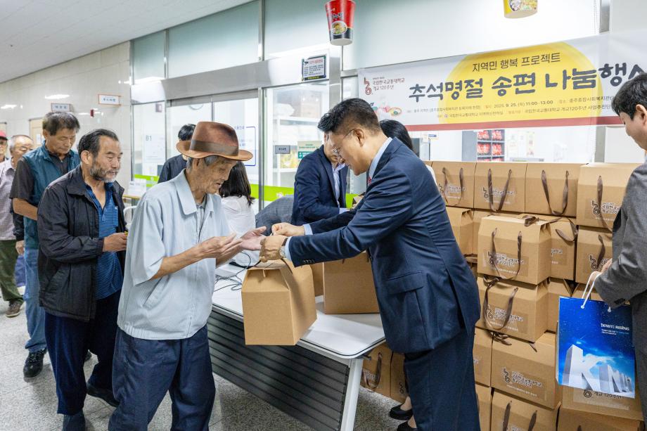 이날 행사는 송편을 비롯해 한과와 식혜 등을 정성스럽게 담은 나눔 박스를 충주종합사회복지관에 등록된 240명의 주민에게 직접 전달함으로써 지역 취약계층이 따뜻한 명절을 보낼 수 있도록 나눔의 가치를 실천하고 지역사회와의 소통 및 상생을 도모하는 뜻깊은 자리였다.