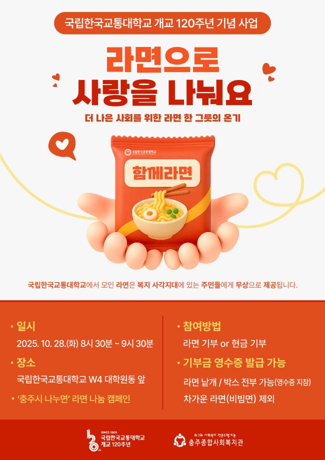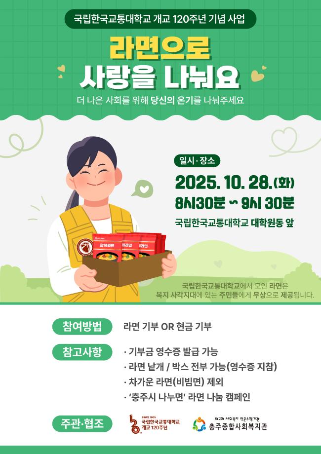 이날 교직원과 학생들은 ‘충주시 나누면’의 취지에 공감하며 자발적으로 라면 기부에 동참했다. 대학 구성원들은 이번 나눔을 통해 지역사회와 상생하며, 작은 실천으로도 이웃에게 온기를 전할 수 있다는 뜻깊은 메시지를 전했다.