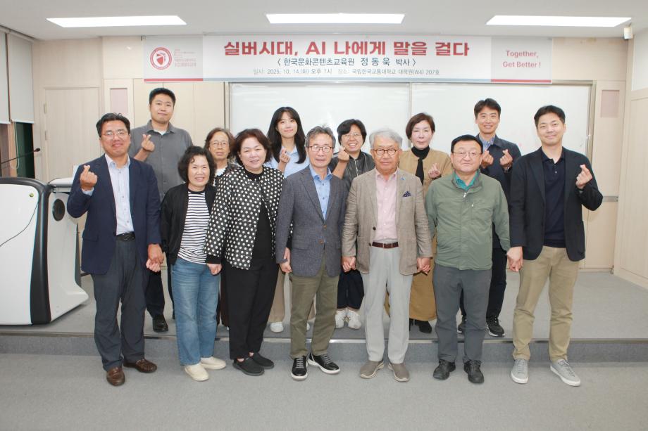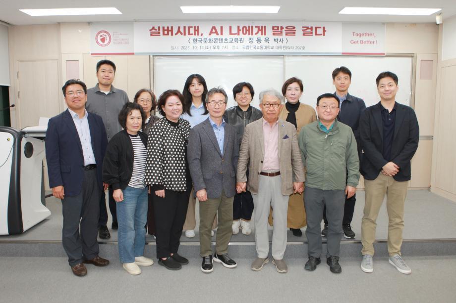 본문 시작 한국문화콘텐츠교육원 정동욱 박사 특강 대학원 행정실 147 2025-10-14 *일시 : 2025.10.14. *강사 : 한국문화콘텐츠교육원 정동욱 박사 *주제 : 실버시대, AI 나에게 말을 걸다 목록 이전2023년 제24기 최고경영자과정 개강식 다음대일감정원 이홍규 박사 특강