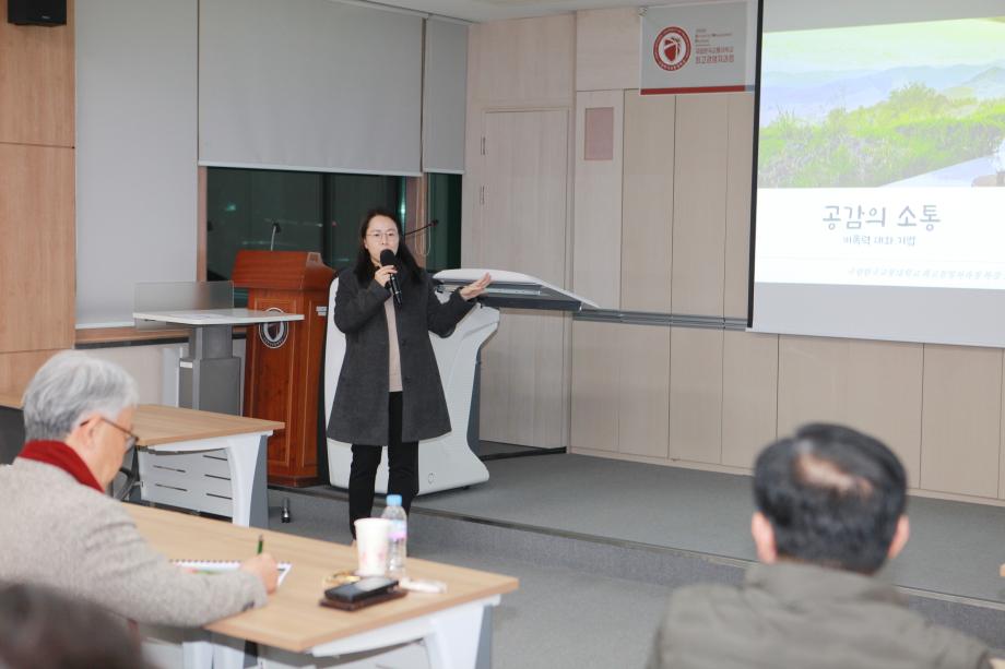 본문 시작 임상심리전문가 조수아 강사 특강 대학원 행정실 65 2025-11-25 *일시 : 2025.11.25. *강사 : 임상심리전문가 조수아 *주제 : 공감의 소통, 비폭력 대화법 목록 이전2023년 제24기 최고경영자과정 개강식